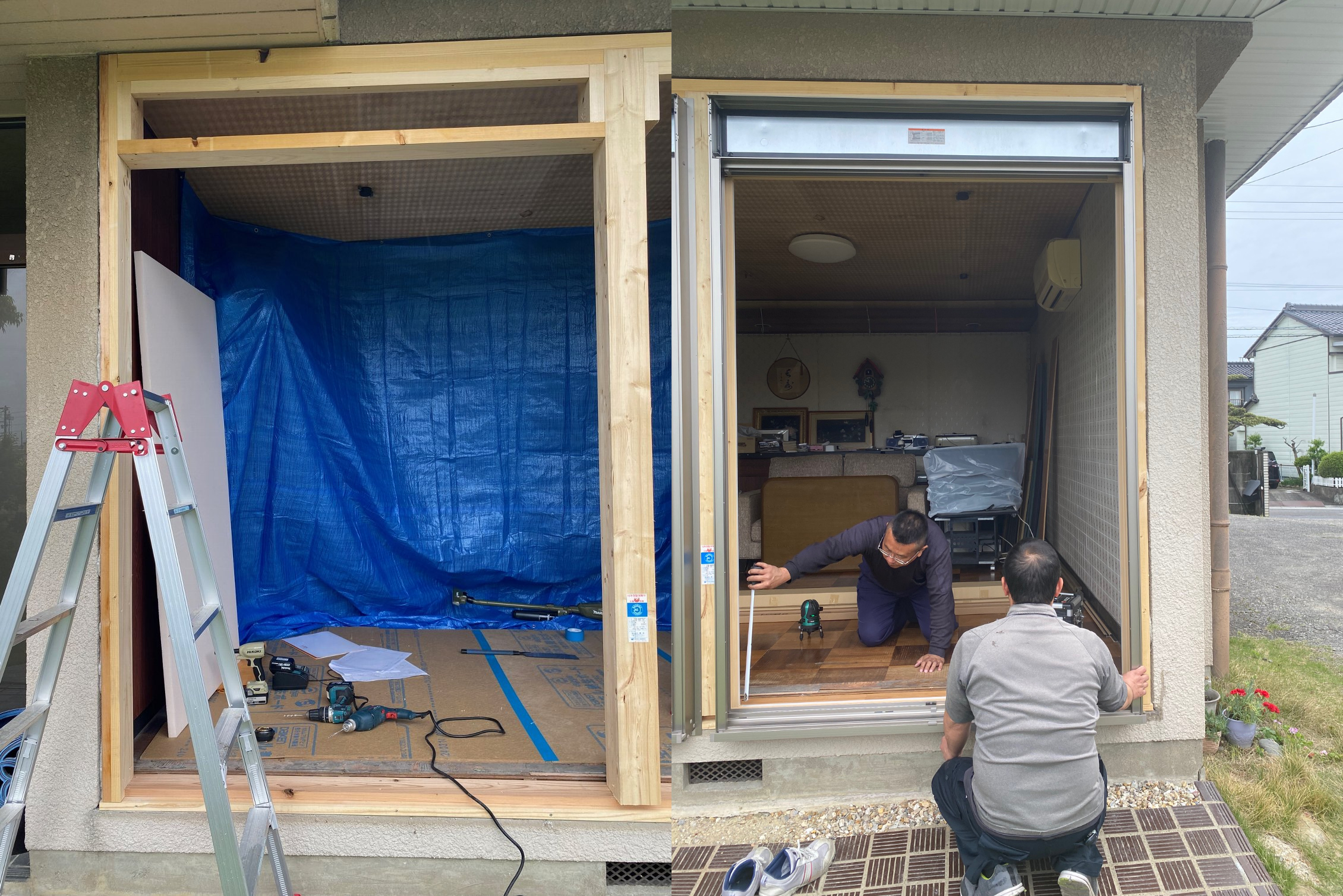 応接間側は にけん幅であった既存の連結窓→ いっけん幅のシャッター付きサッシを2つに分割