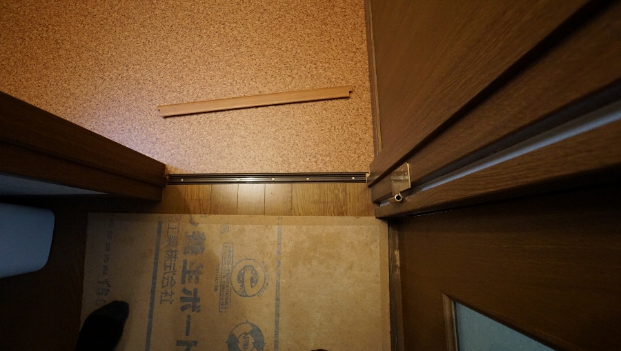 ↓ 内装工事の中川君に来てもらい、コルク柄のクッションフロアを貼ってもらい、幅木を再取り付けしました。