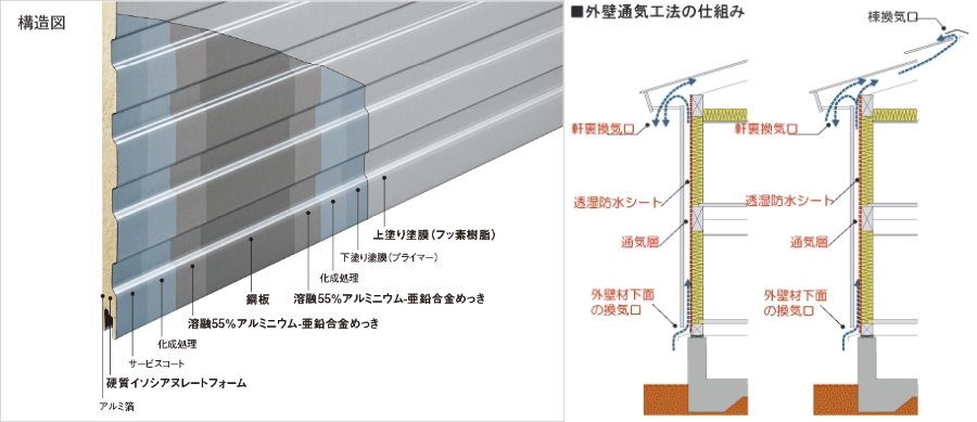 ※金属サイディングの断熱材←中空通気層→構造内部の断熱材 により、高い断熱効果