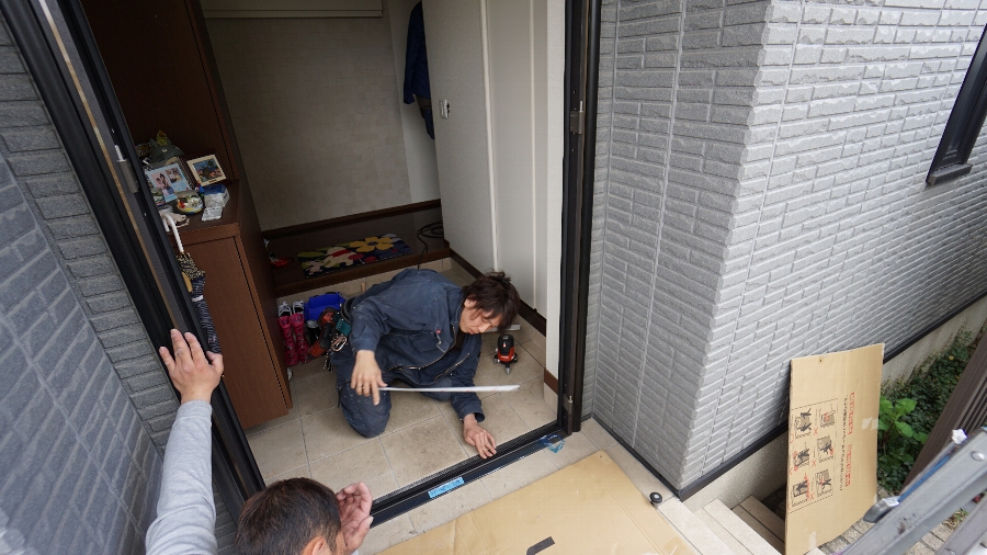 ↓既に既存ドアを取り外し 新しい枠材が取り付けられています。リクシル施工者での工事です。